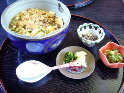I can't remember what this is, but it might have been donburi. Specifically oyako donburi. Oyako means 'mother and daughter,' and in this case is chicken and egg. Interesting!