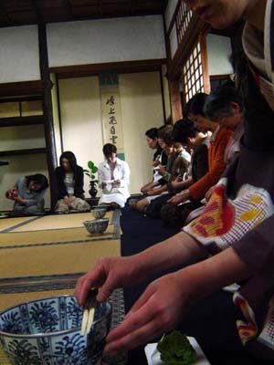The woman in the background is looking at the markings of the bowl. The bowl is actually what the tea ceremony is all about. It is usually an important, and very old bowl with lots of stories. Before going into this room everyone waits in a waiting room where there is a book with the whole history of the bowl. So when they go in for the tea (served communally out of the same bowl), they feel they are becoming a part of history, or experiencing something older than themselves. So when they pass the bowl around it's not about sipping the tea (actually you can only have a tiny bit if it's to last for everyone) - but rather the bowl.