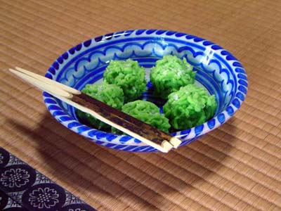 This is some shaved ice (also at Shōkoku-ji) with green tea flavoring. The balls are not leechi, but rather chewy desert balls made from pounded rice paste, called dango (like mochi). It looks better than is is.