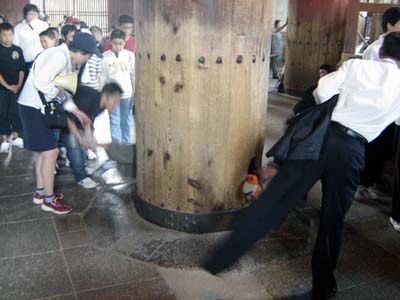 Inside Todai-ji, there was this huge pillar. They say if you can fit through a hole cut through it, you will have a long life.
