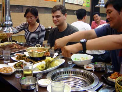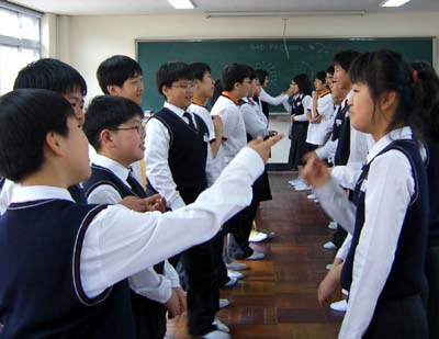 Next thing I knew I was waking up. It was much hotter and sunnier. Hours had passed! I wasn't late yet, but I had to run back to the school and meet Scott immediately. I locked up my bike near the school, and walked into the gates. Scott met me and told me we'd meet some of the other teachers in the teachers' room and then have lunch with the students. We went to the teachers room (which was just like they are in Japan), and met some teachers he liked, and some teachers he didn't like so much (he was giving a running comentary on the real inner-workings of being an ESL teacher in Korea - and all the fun AND annoying things about it). The we went to have school lunch. In Japan, the students eat lunch IN their classroom, at their desks. I was surprised by this in Japan, but I guess there's no real reason to have a whole other room for eating, that remains empty the rest of the day. But in Korean schools (or at least this one) they have a normal caffeteria, just like we do in the US. The only differnece is that (just like in Japan) instead of having the kids go into a kitchen in the building to pick up their food choices, the food is delivered in huge bowls, and the bowls are all put on a long table in the caffeteria. The students all line up and take a spoon of each thing (army-style). The teachers actually get a different room, but Scott likes to eat with the students. Same for me in Japan. Teachers would normally eat in the teachers room if they weren't a homeroom teacher, but I always ate with students in whatever class I hadn't been to in a while. It was always a riot for them.