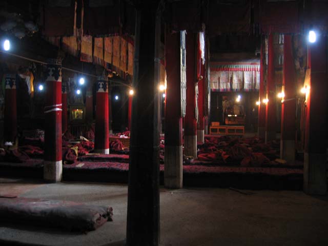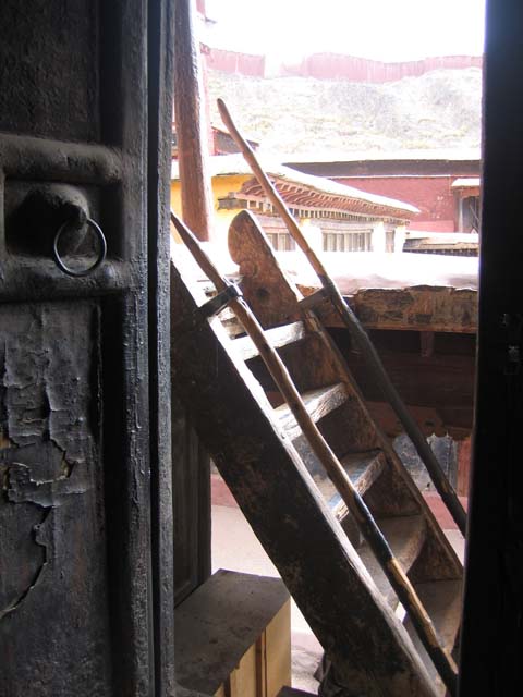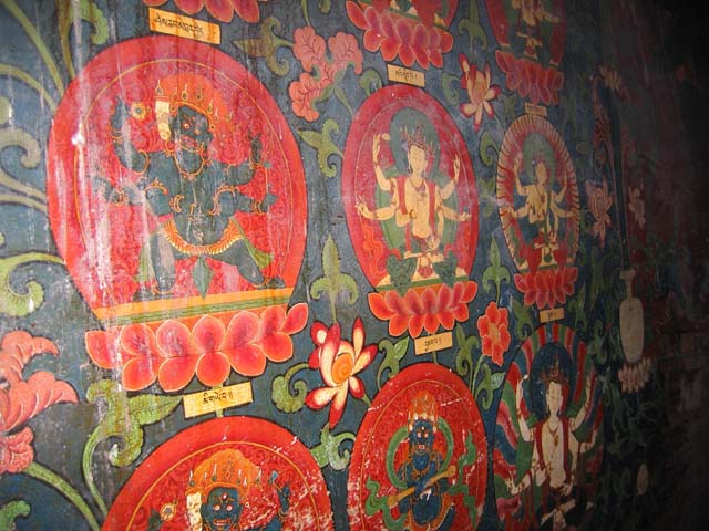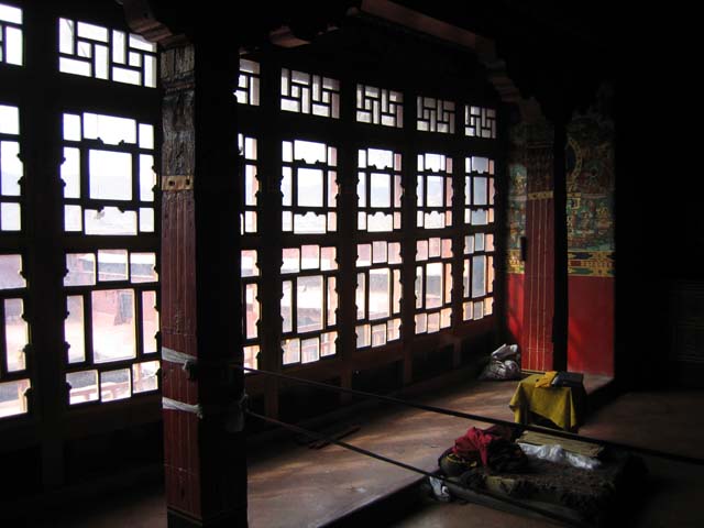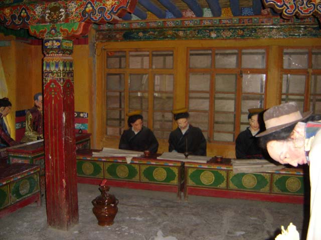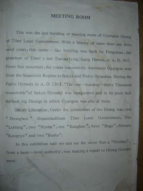 (copied from sign below with no further explanation of "government terms") Meeting Room This was the last building or meeting room of Gyanse Dzong, the Tibetan local government. With a history of more than a thousand years, this castle-like building was built by Pangutsan, the grandson of Tibet's last Tsanpo (king) Lang Darma, in 967AD. From this mountain, the rulers successfully dominated Gyanse area from the Separatist Regime to Sakya and Padru dynasties. During the Padru dynasty in 1364, "The one-hundred-thirty thousand households" of Sakya dynasty was reorganized and in its place built thirteen big Dzongs in which Gyanse was one. Before Liberation, under the jurisdiction of the Dzong was: In this exhibition hall we can see the scene that a "Genbao", from a basic level authority, was making a report to the Dzong government. |