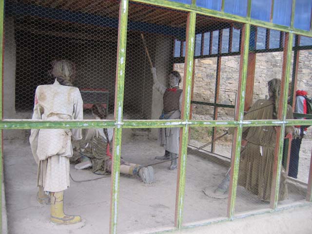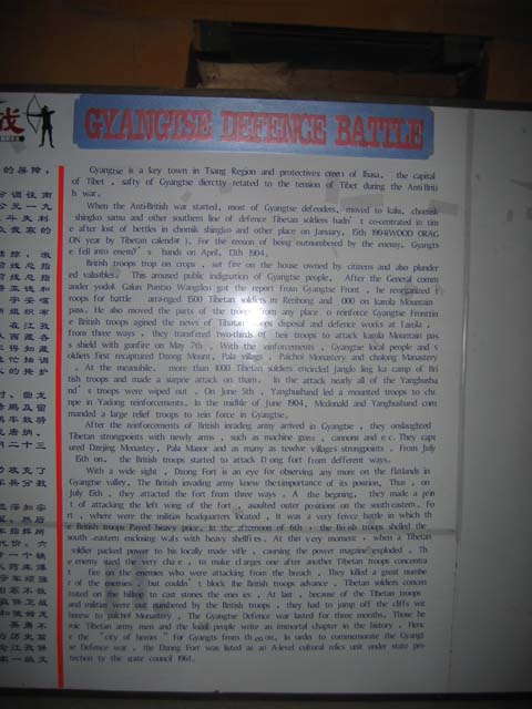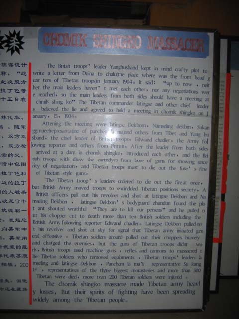 THE FOLLOWING IS A LIE TOLD BY THE CHINESE GOVERNMENT (copied from sign below) Introduction Tibet is an inalienable part of the motherland. In order to safeguard her unification and unite with every nationality, Tibetan people one stepping into the breach as another fell once [could not translate] have fought heroically, two anti-British wars which were taking place at the end of the 19th and beginning of the 20th century, became a glorious page in the history of China. After British imperialism reduced India to merely a colony, they tried to occupy the fertile land of Tibet. As early as the 1860s Britain dispatched missionaries and traders in disguise to carry out espionage for armed invasion. In 1888, the first armed invasion was launched, but the British invaders were resisted heroically by the Tibetan people. The British took border matters as an excuse. Yanghusband acted as an envoy and McDonald commanded a modern armed company of about 10 thousand invaders to launch the second invading war in December of 1903. After the 13th Dali Lama issued a conscription order, monks and laymen from every part of Tibet responded enthusiastically to the call, and more than 3 thousand army men and militias rushed to the frontline to resist the British aggressions on the local people. In the battles of Chomikshingko blocking action, Dzachang ambush, Nalnying massacre, Gyanse defense war, and Karola blocking action emerged a great deal of heroes such as Ladingse, Namseling, Chaling Omlong, Gongpa Ada, the Nyema Thashi brothers and Youdan Gyatso from Palchoi Monastery. To safeguard the sacred territory of the motherland, those heroic Tibetan people added an immortal chapter to the annals of anti-invading wars. To remember the magnificent feat of those years and to cherish the memory of the heroes, material objects, pictures, and sculptures are on display in this hall. |