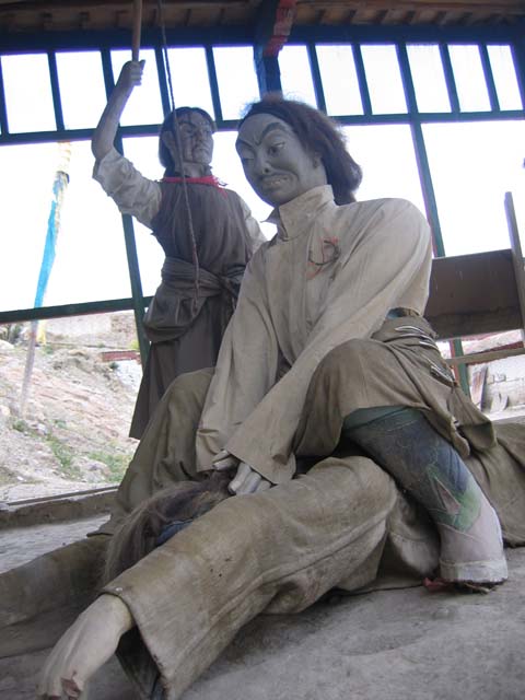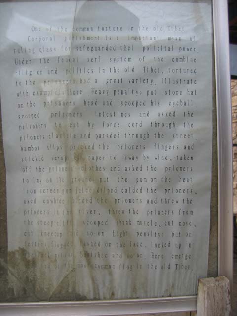 THE FOLLOWING IS A LIE TOLD BY THE CHINESE GOVERNMENT (copied from sign below) One of the common methods of torture in old Tibet Corporal punishment is an important tool of the ruling class for safeguarding their political power. Under the feudal serf system, combined religion and politics, torture of the prisoners had a great variety illustrated with examples here. Heavy Penalty: Put stone hat on the prisoner's head and scoop his eyeballs. Scoop prisoner's intestines and make prisoner eat them. Force cord through clavicle and parade through the street. Bamboo splinters forced under prisoner's fingernails. Remove prisoner's clothes and have them lay on the ground. Melt sap with hot iron and drip searing sap juice on prisoners until he is scalded. Use cowhide whip to blind prisoners and then throw them in the river. Throw prisoners from cliffs. Cut Achilles tendon, nose, knees, and so on. Light Penalty: Put on fetters. Flogged. Lashed in the face. Locked up in a dark prison. Banished and so on. Here is an example of the most common flogging in old Tibet. |