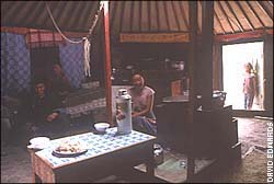 We Americans tried to observe the household rules of all gers--don't lean against the wall, don't point your feet at the hearth--but Lhagra had reason to criticize one aspect of our manners. We were always saying tand bayarlaa, "thank you," which was unnecessary, almost insulting. Every Mongol has been forced to take refuge in someone else's ger at one time or another. The tradition is one of unthinking generosity. Guests are fed and feted as a matter of course, and there are numerous small niceties in the rituals. The tea, for instance, has to be made in the guests' sight. It contains mare's milk and salt. An acquired taste. The yogurt, on the other hand, is sweet and delicious, the best I've ever had.